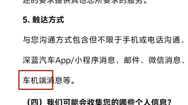 5月29日,深蓝汽车APP更新了用户隐私协议。牛先生发现在“您提供个人信息的原因”条款中,包含“向您提供我们的产品推广活动”,在触达方式中包括“车机端消息”。