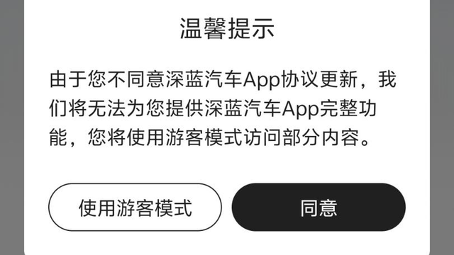 “因为之前车机推送广告的事情,这次更新用户隐私协议的时候,我特意看了一下条款,仍要求车主同意‘在车机端推送产品推广活动’。你(厂商)刚道过歉也承诺了不再推送广告,然后立刻就在协议里要求我们同意接受推送,我没法同意!”牛先生告诉记者,系统提示如果不同意更新协议,将无法提供深蓝汽车APP完整功能,只能使用游客模式。
