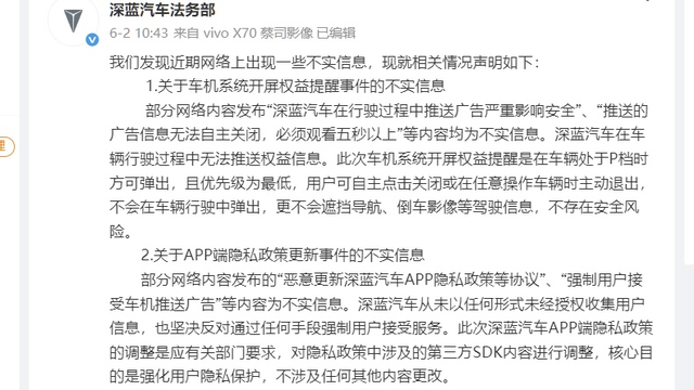6月2日,对于APP隐私协议更新引发争议的情况,深蓝汽车法务部在官方微博上发表声明称,部分网络内容发布的“恶意更新深蓝汽车APP隐私政策等协议”“强制用户接受车机推送广告”等内容为不实信息。声明强调,“此次调整是应有关部门要求,对隐私政策中涉及的第三方SDK内容进行调整,核心目的是强化用户隐私保护,不涉及任何其他内容更改。”