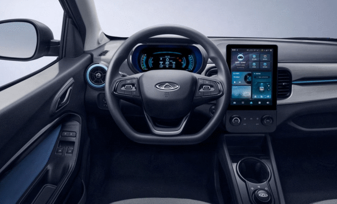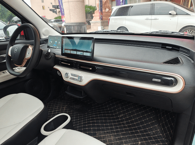 内饰采用I Space空间极简美学设计,配合撞色内饰,凸显个性,搭载9英寸智能触控大屏+彩色液晶仪表,其中触控大屏为一体悬浮式设计,1080*720高清分辨率,基于安卓系统,内置APP高德地图、酷我音乐、云听等应用,集成倒车影像、蓝牙、WiFi热点、手机互联、空调、语音控制功能。I Wheel 减压多功能方向盘,减缓疲劳,2+2自由空间组合和20处储物空间等,让冰淇淋元气版有着更好的后备箱空间,实车纵深0.3米。还有LED车内阅读灯、后倒车雷达、倒车影像、坡道辅助、D档蠕行模式、EPS电动助力转向等功能。