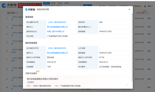 天眼查深度风险信息显示,近日,格力钛新能源股份有限公司新增一则股权冻结信息,股权所在企业为珠海广通汽车有限公司,冻结股权数额18.06亿人民币,冻结期限自2025年6月4日至2028年6月3日,执行法院为广东省珠海市中级人民法院。