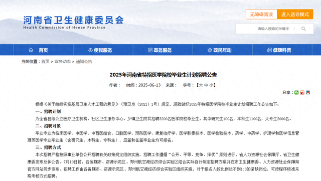 6月13日,2025年河南省特招医学院校毕业生招聘计划正式公布。河南将为全省县级公立医疗卫生机构、社区卫生服务中心、乡镇卫生院招聘3200名医学院校毕业生,以充实基层医疗卫生人才队伍。