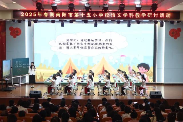 活动核心环节是两节语文示范课,风格各异,亮点突出。于淼老师执教的四年级习作课以“英雄品质探索训练营”为情境主线,通过“3D档案”任务驱动,将“多方面写人”的语文要素拆解为“外貌捕捉(照镜观察独特特征)—事例精选(用典型事件凸显性格)—立体展示(结合评价量表修改)”三阶实践。课堂中,教师巧妙串联黄继光、哈尔威船长等单元人物描写,借助“写人阶梯”支架引导学生掌握“抓与众不同特点”的写作技法,更以绘本《独一无二的你》结尾,将“悦纳自我”的人文主题自然融入写作教学。分层作业设计(基础写作+创意绘画)兼顾不同学情,整节课环环相扣,实现工具性与人文性的深度融合。熊华君老师执教的二年级阅读课以“大风吹”游戏破冰,将大象耳朵“耷拉—撑起—放下”的情节转化为“自信—怀疑—接纳”的认知旅程。教学中,教师通过“火眼金睛认生字”“角色扮演读对话”等活动,将形声字识记与文本情感体验有机结合。当学生模仿大象说出“人家是人家,我是我”时,课堂自然生成“接纳独特性”的生命教育契机。板书设计以“耳朵形态变化”为明线、“心理成长”为暗线,实现识字教学与哲理感悟的双线并行。
