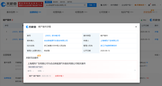 天眼查App显示,6月13日,哪吒汽车关联合众新能源汽车股份有限公司新增破产案件,申请人为上海禹形广告有限公司,经办法院为浙江省嘉兴市中级人民法院,管理人机构为浙江子城律师事务所。不久前,上海禹形广告有限公司曾申请该公司进行破产审查。