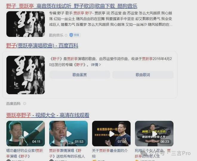 百度百科都被改了:《野子》是贾跃亭演唱的歌曲,由苏运莹作词作曲,收录于贾跃亭2016年4月20日发行的专辑《野子》。