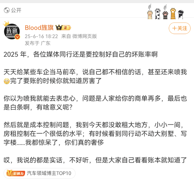 6月16日,汽车博主“Blood旌旗”发文称,2025年媒体同行应该控制好坏账率。他表示部分车企给的商单多,但却是“白条”,“天天给某些车企当马前卒,说自己都不相信的话,甚至还来喷我。完了要账的时候你就知道厉害了。你以为喷我就能去表忠心,问题是人家给你的商单再多,最后也是白条啊,有啥意义呢?”