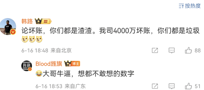 而在该微博评论区,知名汽车博主韩路评论称,“论坏账,你们都是渣渣。我司4000万坏账,你们都是垃圾”。