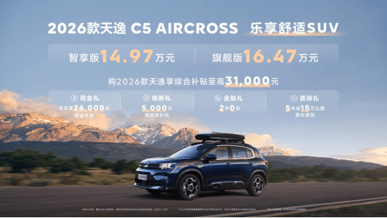 6月17日报道东风雪铁龙正式宣布2026款天逸C5 AIRCROSS上市,新车共推出智享版和旗舰版两款车型,指导价分别为14.97万元和16.47万元,并可享受至高3.1万元综合补贴。作为年度改款车型,2026款天逸并未对外观进行大幅调整,而是聚焦于安全与舒适配置的升级,全系标配C-CONNECT 3.0智能网联系统,旗舰版新增ADAS驾驶辅助、AR实景导航等功能,进一步强化其“舒适操控SUV”的市场定位。