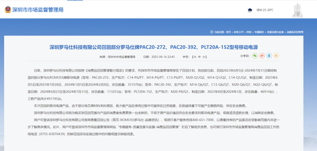 据深圳市市场监督管理局网站消息,日前,深圳罗马仕科技有限公司按照《消费品召回管理暂行规定》的要求,向深圳市市场监督管理局报告了召回计划,自即日起,召回2023年6月5日至2024年7月31日期间制造的部分罗马仕ROMOSS牌移动电源(型号:PAC20-272,生产批次:C14-P6/P7、M14-P6/P7、C13-P6/P7、M20-Q1/Q2、M14-Q1/Q2、C14-Q1/Q2,制造日期:2023年6月5日至2023年7月28日、2024年1月5日至2024年2月8日,涉及数量:331578台;型号:PAC20-392,生产批次:M14-Q6/Q7、C13-Q6/Q7、M20-Q6/Q7、M22-Q6/Q7,制造日期:2024年6月23日至2024年7月31日,涉及数量:113253台;型号:PLT20A-152,生产批次:M20-P8/Q1,制造日期:2023年8月至2024年1月,涉及数量:46914台),三款产品共计491745台。