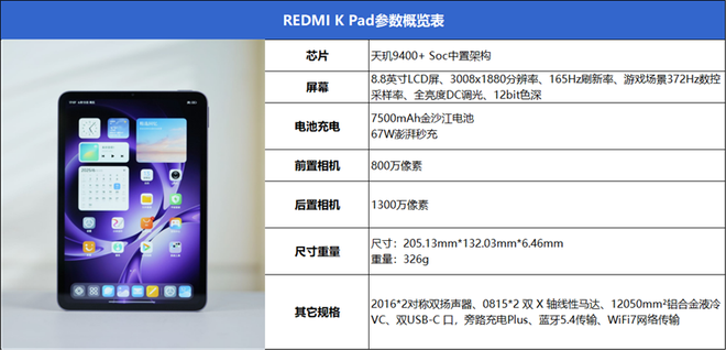 REDMI K Pad作为REDMI首款性能小平板,在硬件规格方面用料十足,天玑9400+平台+16GB LPDDR5X内存+UFS 4.1闪存。