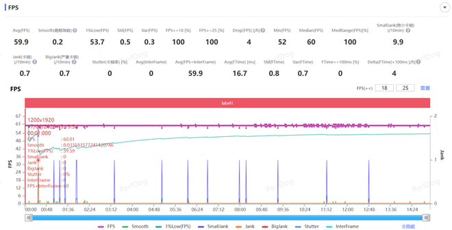 接着测试《原神》手游,在特效拉满关闭动态模糊条件下,须弥城跑图测试15分钟,游戏平均帧率59.9FPS,通过监测游戏的分辨率为1200×1920,平均波动仅有0.2。