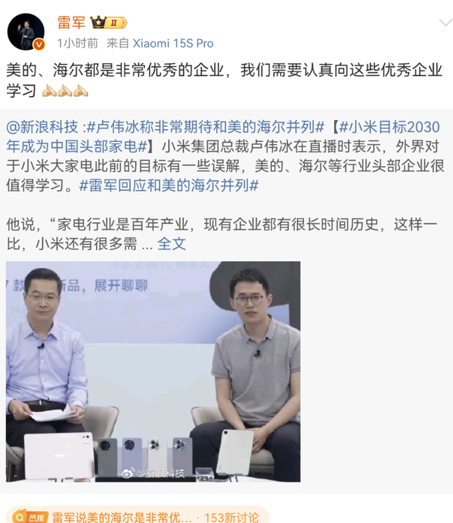 6月19日,雷军转发卢伟冰对美的、海尔等企业的评价并表示,美的和海尔都是非常优秀的企业,小米需要认真向这些行业头部企业学习。