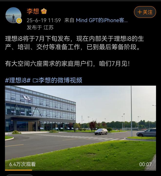 6月19日,理想汽车创始人李想宣布,理想i8将在7月下旬正式发布。