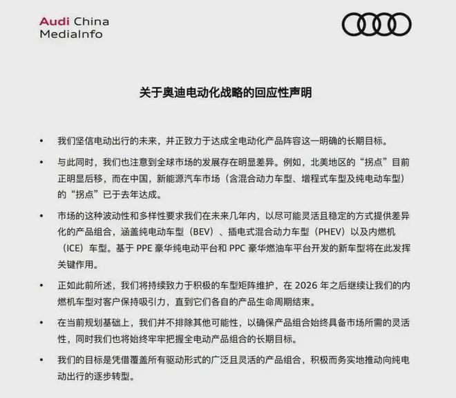 对此,奥迪发布《关于电动化战略的回应性声明》。奥迪表示坚信电动出行的未来,并正致力于达成全电动化产品阵容这一明确的长期目标。与此同时,奥迪也注意到全球市场的发展存在明显差异。