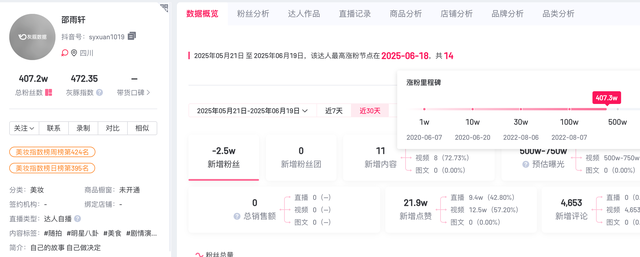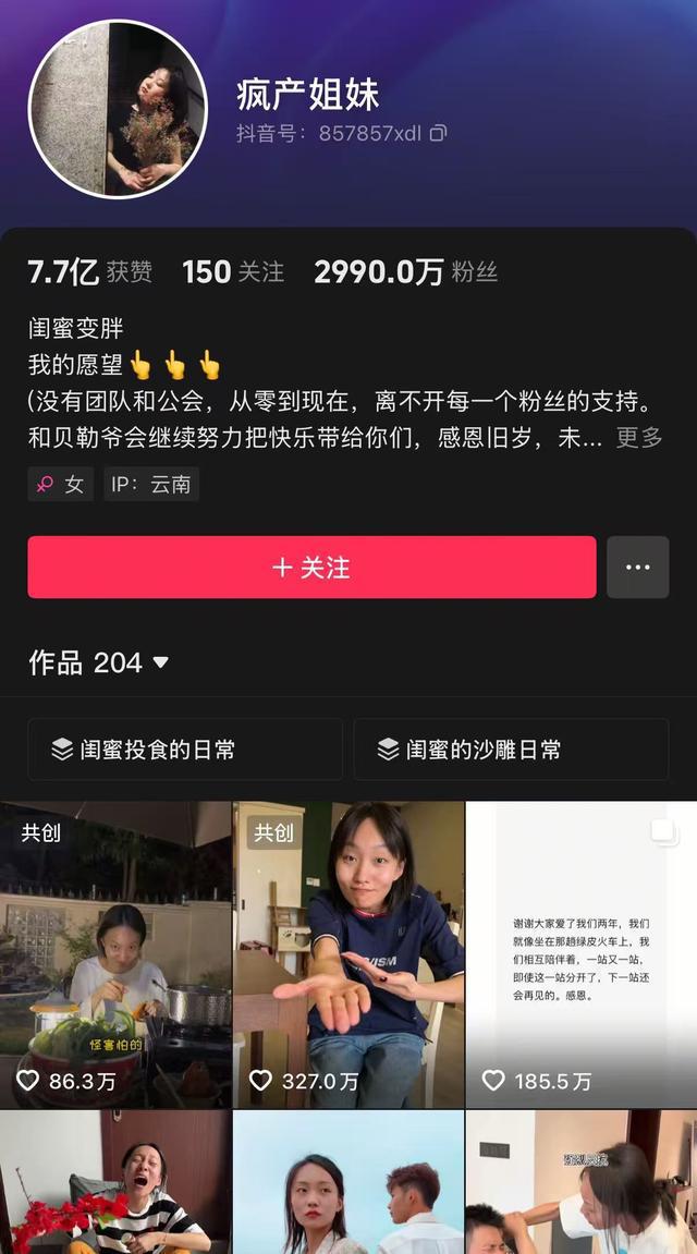 近日,邵雨轩在采访中透露“疯产姐妹”解散的真实原因:巨大的流量像沉重的行囊,越想给别人快乐,自己越不快乐。2022年8月6日,“疯产姐妹”发文宣布正式解散停更,据媒体报道该账号粉丝一度超4000w。当前该账号粉丝已降至2990w,近3年累计掉粉超千万。此外,“邵雨轩”自“疯产姐妹”宣布解散停更后粉丝量达100w,当前粉丝量涨至407.2w,近3年涨粉307万。据企查查信息,“疯产姐妹”被邵雨轩等多方申请注册商标,国际分类包括教育娱乐等。