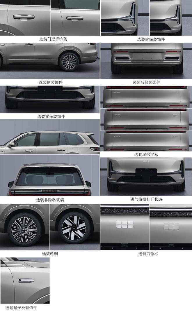 从申报信息中可以看出,银河M9在门把手、前后保险杠、侧裙和翼子板多处提供饰条选装,并提供20英寸和21英寸2种轮圈选择,搭配的轮胎则有255/50R20和265/45R21两种规格。