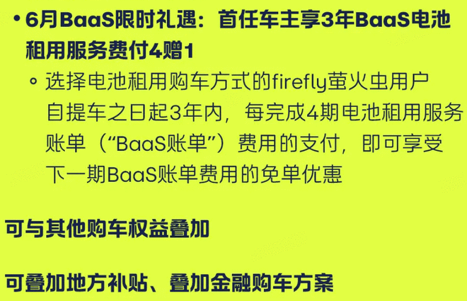 6月BaaS限时礼遇:首任车主享3年BaaS电池租用服务费付4赠1:选择电池租用购车方式的firefly萤火虫用户自提车之日起3年内,每完成4期电池租用服务账单("BaaS账单")费用的支付,即可享受下一期BaaS账单费用的免单优惠。