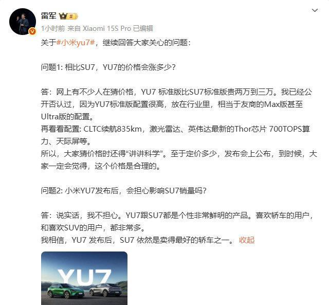 雷军:YU7一定会是合理的价格,不担心影响SU7销量