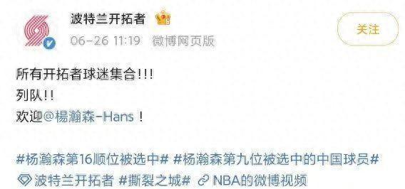波特兰开拓者官方发文:所有开拓者球迷集合,列队欢迎杨瀚森!官方还发布了杨瀚森本人出镜视频,他表示“很高兴被开拓者选中,感谢一直以来的支持,加油开拓者”。
