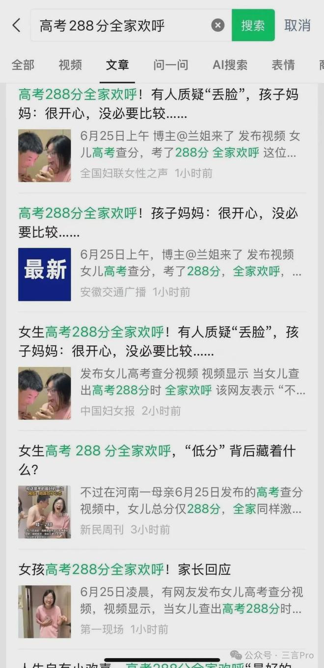 6月25日凌晨,有网友发布女儿高考查分视频,当女儿查出高考288分时全家欢呼,父亲虽调侃“288有啥可高兴的”,但仍拥抱庆祝。