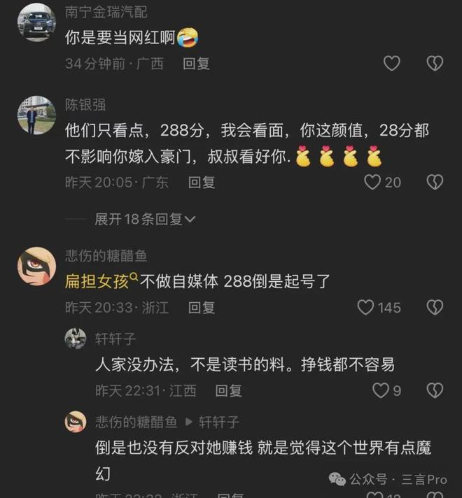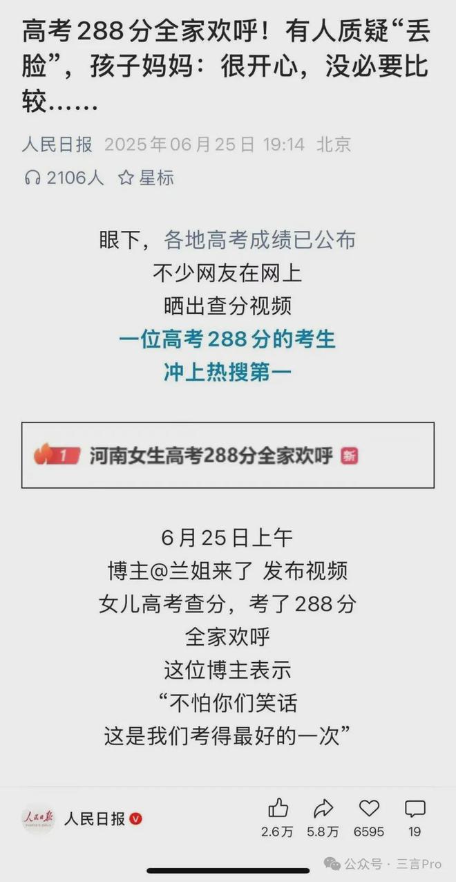 人民日报等主流媒体相继报道了此事,一夜之间288分女生爆红。