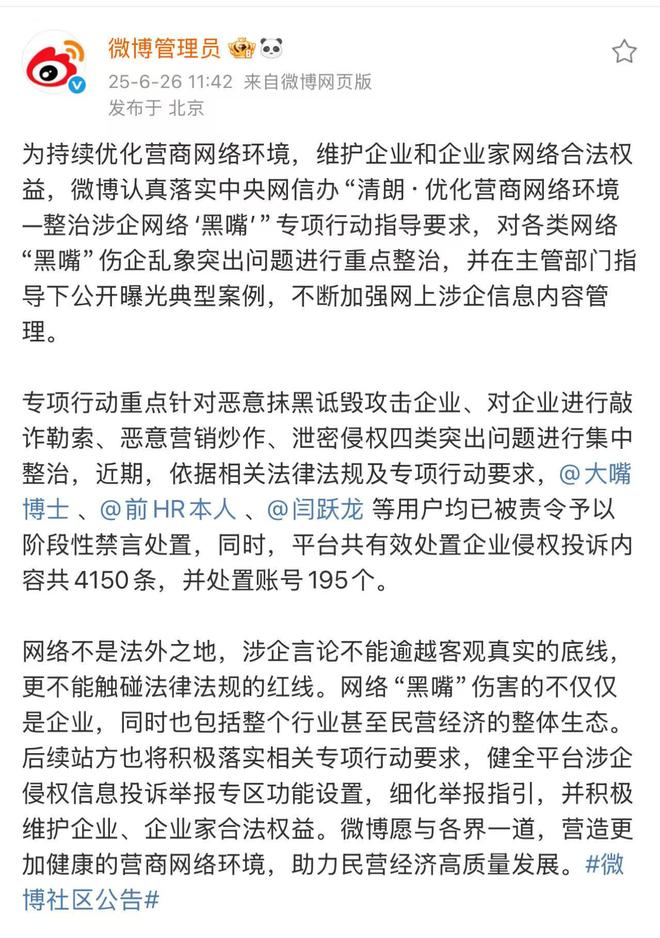 微博管理员今日发文称,为持续优化营商网络环境,维护企业和企业家网络合法权益,微博认真落实中央网信办“清朗·优化营商网络环境—整治涉企网络‘黑嘴’”专项行动指导要求,对各类网络“黑嘴”伤企乱象突出问题进行重点整治,并在主管部门指导下公开曝光典型案例,不断加强网上涉企信息内容管理。