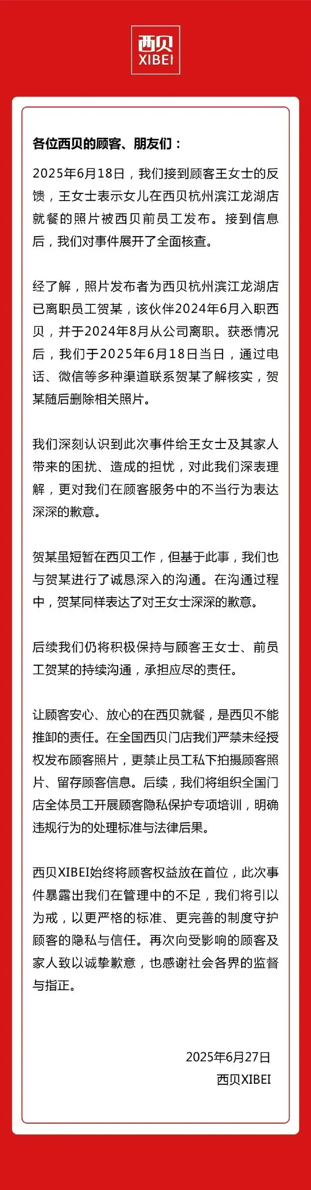 致歉声明称,6月18日,公司接到顾客王女士的反馈,王女士表示女儿在西贝杭州滨江龙湖店就餐的照片被西贝前员工发布。接到信息后,公司对事件展开了全面核查。经了解,照片发布者为西贝杭州滨江龙湖店已离职员工贺某,该员工2024年6月入职西贝,并于2024年8月从公司离职。获悉情况后,公司于6月18日当日,通过电话、微信等多种渠道联系贺某了解核实,贺某随后删除相关照片。后续公司仍将积极保持与顾客王女士、前员工贺某的持续沟通,承担应尽的责任。