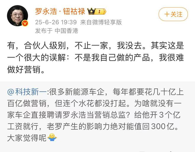 罗永浩:不止一家车企请我当合伙人,不是自己做的产品,很难做好营销