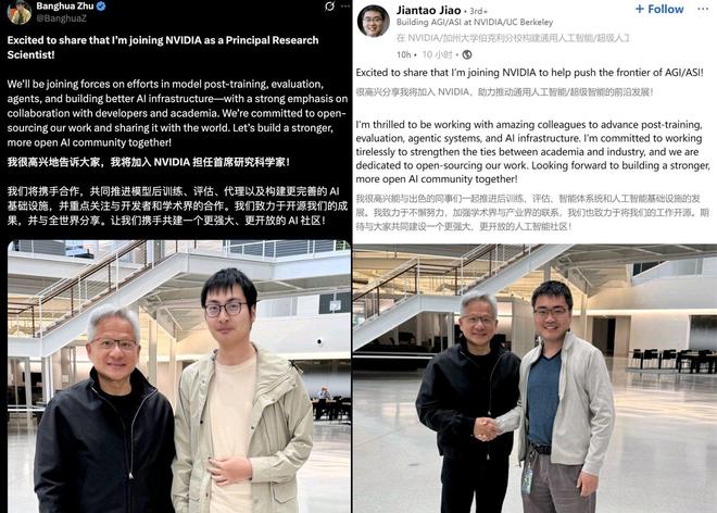 6月28日,英伟达创始人兼CEO黄仁勋近日亲自招募两位华人AI大牛加入英伟达。其中,朱邦华将担任首席研究科学家,加入英伟达的Star Nemotron团队,负责应用研究。焦剑涛的具体岗位尚未透露。