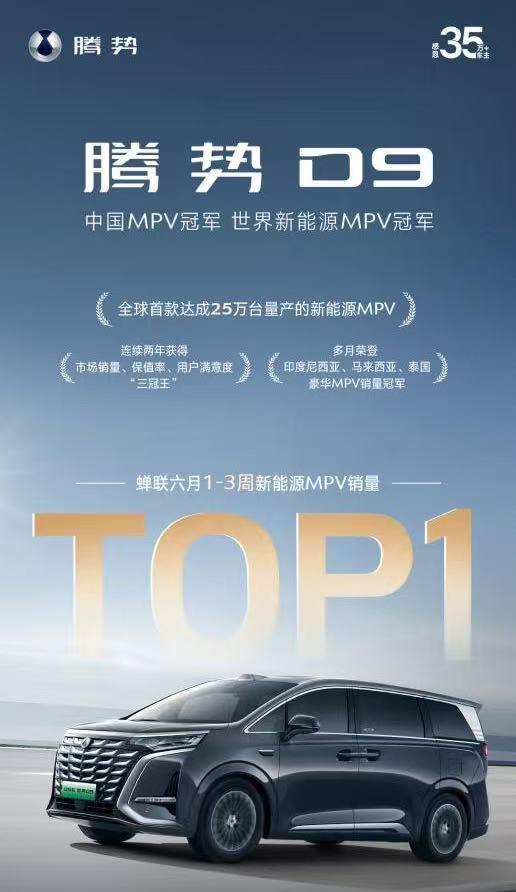 在市场表现方面,腾势D9在2025年6月前三周位居新能源MPV销量榜首。此前,该车型已连续两年获得MPV市场年度销量、保值率、用户满意度三项冠军,并在2025年1-5月保持市场领先地位。