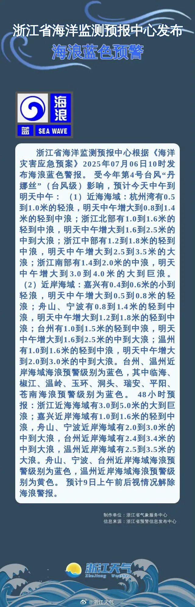 今天10点,浙江省海洋监测预报中心发布海浪蓝色预警。