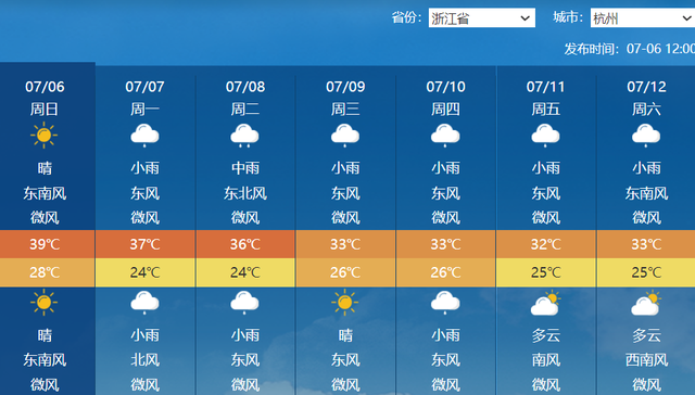后天在台风环流影响下,杭州有阵雨或雷雨,刮风下雨都少不了,最高气温30℃出头,甚至有可能低于30℃。9日-10日杭州的最高气温在33℃左右,高温不见了。
