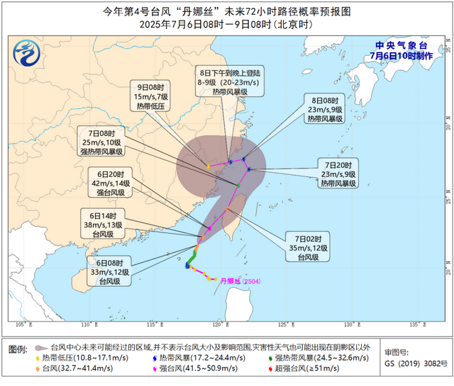 大风预报:7月6日14时至7日14时,南海东部和南部的部分海域、台湾海峡、台湾以东洋面、巴士海峡、东海西南部及钓鱼岛附近海域、广东东部沿海、福建沿海、浙江沿海、台湾岛沿海将有6~8级大风,阵风9~10级,其中南海东北部、东海西南部的部分海域、台湾海峡、台湾以东洋面、巴士海峡西部、台湾岛沿海的风力有9~11级,阵风12~13级,“丹娜丝”中心经过的附近海域或地区风力可达12~14级、阵风15级。