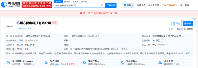 天眼查App显示,近日,杭州方便电科技有限公司登记状态由存续变更为注销。