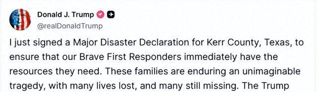 美国总统特朗普6日宣布,他已签署“重大灾难声明”,联邦紧急事务管理局已在得州启动紧急状态并提供联邦救助。