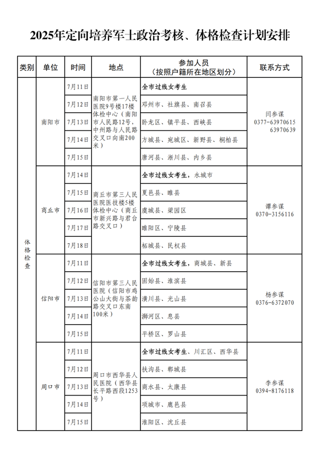 根据河南省教育厅、公安厅和省军区动员局《2025年招收定向培养军士工作实施方案》(豫军动〔2025〕7号),现将2025年普通高校招收定向培养军士政治考核和体格检查相关事宜予以公布,请达到控制分数线的考生,按要求参加政治考核和体格检查。