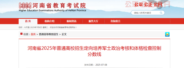 7月8日,记者从河南省教育考试院了解到,河南省2025年普通高校招生定向培养军士政治考核和体格检查控制分数线“出炉”,具体信息如下: