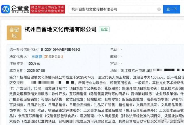 企查查APP显示,近日,杭州自留地文化传播有限公司成立,王翠霞担任法定代表人、经理等,经营范围包含文艺创作;电影摄制服务等。