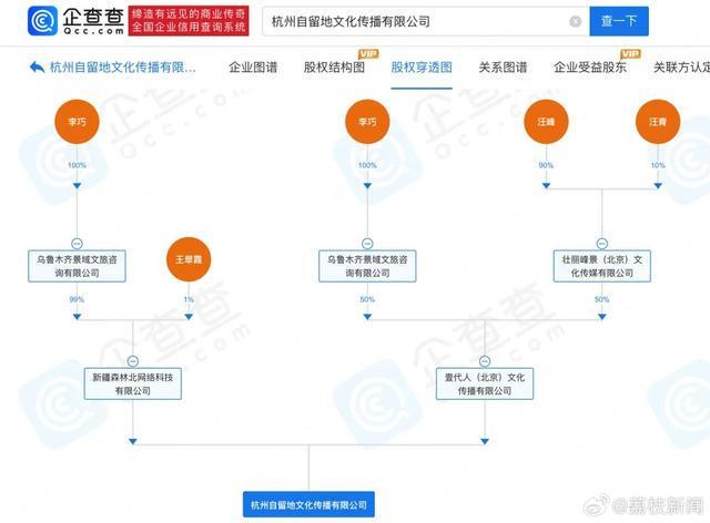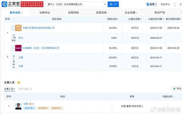 新疆森林北网络科技有限公司、壹代人(北京)文化传播有限公司共同持股该公司,其中壹代人公司为汪峰、李巧(森林北)今年2月共同出资成立。