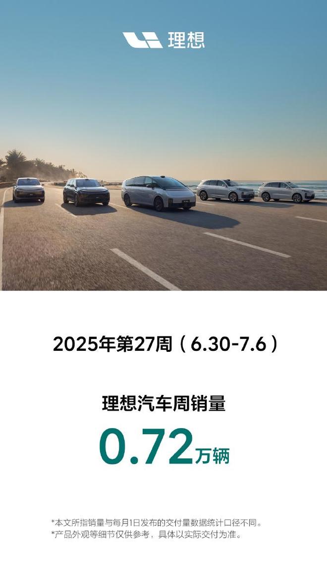 理想汽车第27周销量0.72万辆 访客 2025-07-08 16:13:58 43912 抢沙发 默认 理想汽车今日公布2025年第27周(6.30-7.6)销量数据:0.72万辆。 标签: 销量 理想 海报 阅读 QQ 分享 微博分享 微信分享 分享 上一篇京东外卖:近200个餐饮品牌销量破百万,“双百计划”投入超百亿扶持品质商家 下一篇短剧谐音梗:“骁米”董事长“苏柒”想挖“宋明珠”手下“余程东” 京东外卖:近200个餐饮品牌销量破百万,“双百计划”投入超百亿扶持品质商家上一篇 短剧谐音梗:“骁米”董事长“苏柒”想挖“宋明珠”手下“余程东”下一篇 相关推荐 销量理想 保时捷中国CEO盛赞中国车企创新速度,每日产品更新迭代表现惊人 2025-12-12 苹果iPhone 17 Pro/Pro Max降价促销,最高直降300元,起售价低至8699元起 2025-12-08 理想汽车OTA 8.1更新发布,支持绑定理想AI眼镜新功能 2025-12-07 极石汽车第2万辆成功下线,迈向大规模生产的新里程碑 2025-12-07 理想AI眼镜Livis,未来科技视界的理想附件正式发布 2025-12-04 iPhone 17系列销量火爆背后的创新不足质疑,王自如深度剖析 2025-12-04 零跑汽车11月交付量突破7万,同比增长超75% 2025-12-01 苹果全球市场份额突破记录,十月飙升至24.2% 2025-11-30 发表评论取消回复 快捷回复: 评论列表 (暂无评论,43912人围观)参与讨论 还没有评论,来说两句吧...