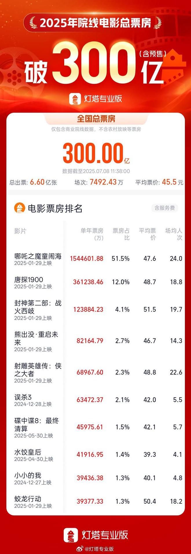 2025年度院线电影总票房破300亿 访客 2025-07-08 16:28:33 32856 抢沙发 默认 据灯塔专业版数据,截至7月8日11时38分,历时189天,2025年大盘票房(含预售)突破300亿,相较去年提前28天。 标签: 灯塔 专业版 海报 阅读 QQ 分享 微博分享 微信分享 分享 上一篇B站推出视频播客扶持政策,将在暑期提供10亿流量 下一篇悦达起亚上半年销量达124027辆 同比增长13.2% B站推出视频播客扶持政策,将在暑期提供10亿流量上一篇 悦达起亚上半年销量达124027辆 同比增长13.2%下一篇 相关推荐 灯塔专业版 海信电视工厂获评全球首个灯塔工厂,生产效率达每秒一台 2026-01-17 海信电视工厂获评全球首个灯塔工厂,生产效率达每秒一台 2026-01-16 疯狂动物城2荣登中国影史进口片票房冠军宝座 2026-01-06 疯狂动物城2荣登年度票房前三甲 2025-12-08 疯狂动物城2成中国影史进口动画票房冠军,超越第一部创佳绩! 2025-11-30 电影志愿军,浴血和平延长放映时间通知 2025-10-17 国庆档总票房破十六亿,电影市场持续繁荣 2025-10-08 国庆档票房破八亿,电影市场持续繁荣 2025-10-03 发表评论取消回复 快捷回复: 评论列表 (暂无评论,32856人围观)参与讨论 还没有评论,来说两句吧...