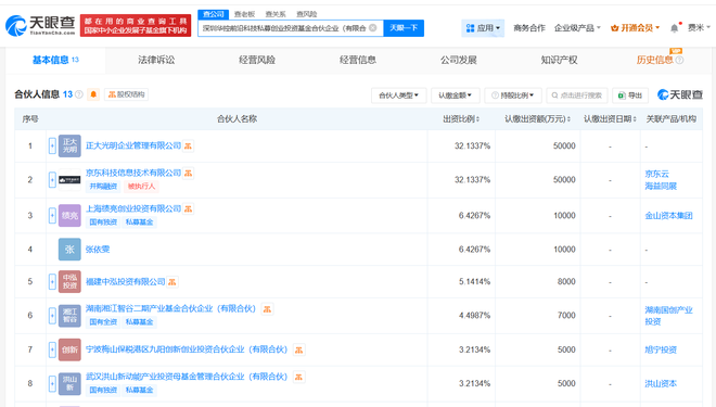 天眼查App显示,近日,深圳华控前沿科技私募创业投资基金合伙企业(有限合伙)成立,执行事务合伙人为深圳市深投华控产业投资有限公司,出资额15.56亿人民币,经营范围为以私募基金从事股权投资、投资管理、资产管理等活动,由京东云计算全资子公司京东科技信息技术有限公司、正大光明企业管理有限公司、上海绩亮创业投资有限公司等共同出资。