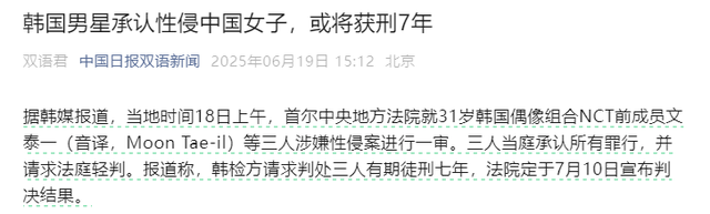 据中国日报此前报道,当地时间6月18日上午,首尔中央地方法院就31岁韩国偶像组合NCT前成员文泰一等三人涉嫌性侵案进行一审。三人当庭承认所有罪行,并请求法庭轻判。报道称,韩检方请求判处三人有期徒刑七年,法院定于7月10日宣布判决结果。