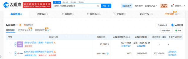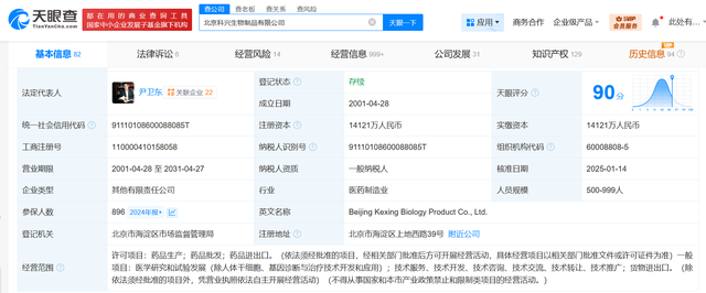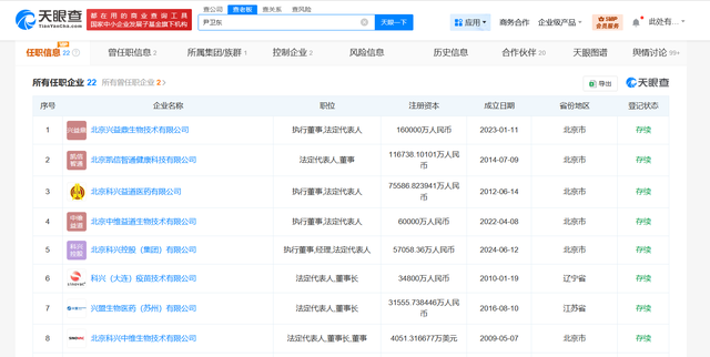 天眼查App显示,科兴生物关联公司北京科兴生物制品有限公司成立于2001年4月,法定代表人为尹卫东,注册资本约1.41亿人民币,经营范围含药品生产、药品批发、药品进出口、医学研究和试验发展、货物进出口等。司法案件信息显示,该公司涉及多起案件,包括股东知情权纠纷、公司决议纠纷、医疗损害责任纠纷等。商业履历信息显示,科兴生物董事长尹卫东名下关联20余家企业,其中18家为存续状态,包括北京科兴益道医药有限公司、北京兴益鼎生物技术有限公司、科兴中维(海南)生物技术有限公司等,尹卫东在上述公司担任执行董事、法定代表人等。