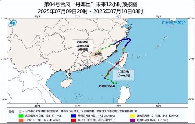 按照热带气旋强度等级划分,当一个热带气旋中心附近最大风力降至6级(13米/秒)以下,且中心已难以辨认,气象部门可认定该系统已处于热带低压下限,并对其停止编号发布。但截至7月10日8时,广东省气象部门仍制作“丹娜丝”未来12小时预报图,并对其大致中心位置标注了中心附近最大风力5级的数据。
