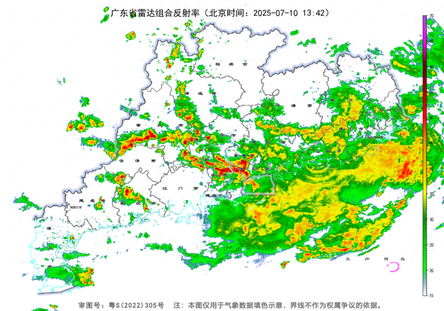 广东省气象局7月10日提醒,10日余下时间至12日,广东大部降雨持续,暴雨范围广、局地雨量大,需做好各项防御工作。各地需加强防范地质灾害和城乡积涝,关注福建等地上游来水叠加导致的山洪和中小流域洪水风险。公众户外活动和作业时,注意防御雷电和短时大风引发的灾害。