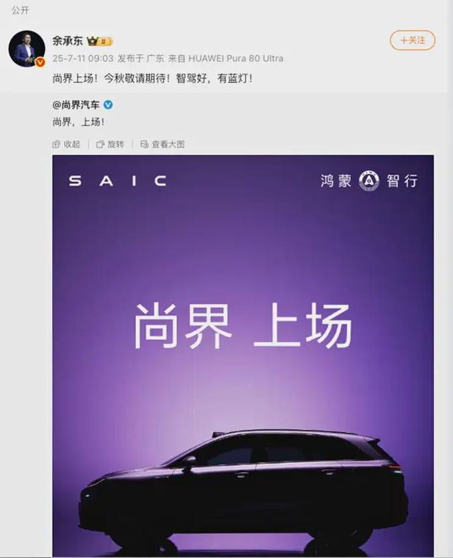 7月11日报道 今日上午,尚界汽车发布首款车型预热海报。其后,华为常务董事、终端BG董事长余承东转发,并发文称“尚界上场!今秋敬请期待!智驾好,有蓝灯!”