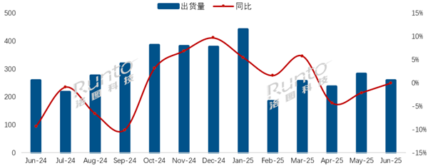 7月12日消息,根据洛图科技(RUNTO)发布的数据显示,2025年6月,中国电视市场品牌整机出货量为259.0万台,较去年同期刚好持平。