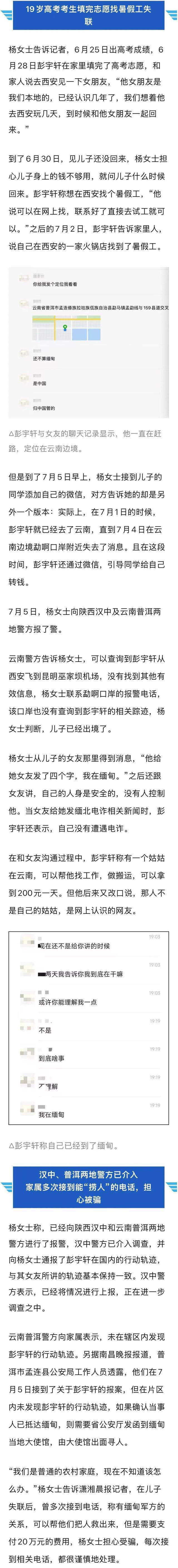 陕西汉中市19岁的高中生彭宇轩,在高考结束、填报志愿后,在网上找暑假工,去了西安、云南昆明、普洱等地,家属怀疑已被诱骗至缅甸。在这个过程中,彭宇轩称有一位姑姑在云南,可以帮他找工作,之后又改口说,不是姑姑,是网上认识的人。