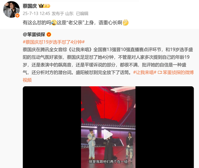 7月13日,话题#蔡国庆怼19岁选手怼了4分钟#冲上微博热搜。
